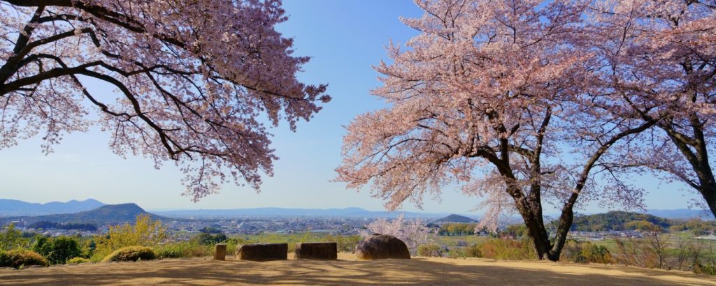 飛鳥の歴史の舞台を望む ~万葉の心に触れる~ 展望広場(標高148m)からは遠く金剛山系から大和三山、藤原京、飛鳥京など大和国原の美しい風景を望むことができます。山頂までの遊歩道沿いには万葉植物などが植えられています。
