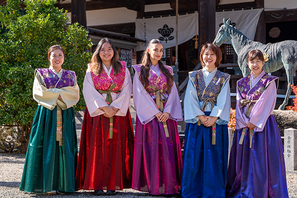 明日香村でご提案するのは、古代装束の撮影を「衣装体験」で終わらせないプログラムです。ポイントは、現代を生きる地域の女性たちとの交流を入口にしながら、明日香が育んできた女性の営みや美意識へ、自然に視点をつないでいくことです。だからこそ、旅の中で“その土地でしか生まれない一枚”が残ります。まず、飛鳥時代に女帝や皇族、その周辺の人々が着用していたと考えられる古代装束を身にまといます。ここで大切にしているのは、単に「それっぽく着る」ことではありません。明日香村を代表する高松塚古墳の壁画には、古代装束をまとった女性像が描かれており、1,400年前の装いを想起できる貴重な手がかりが残っています。したがって、装束のしつらえや所作も含めて、当時の空気感を丁寧に立ち上げます。そのうえで、プロカメラマンが撮影を行います。背景はスタジオではなく、明日香の風景と史跡です。光の入り方、衣の動き、石の質感がそのまま画になりますので、旅の記録ではなく作品としてのポートレートに仕上がります。